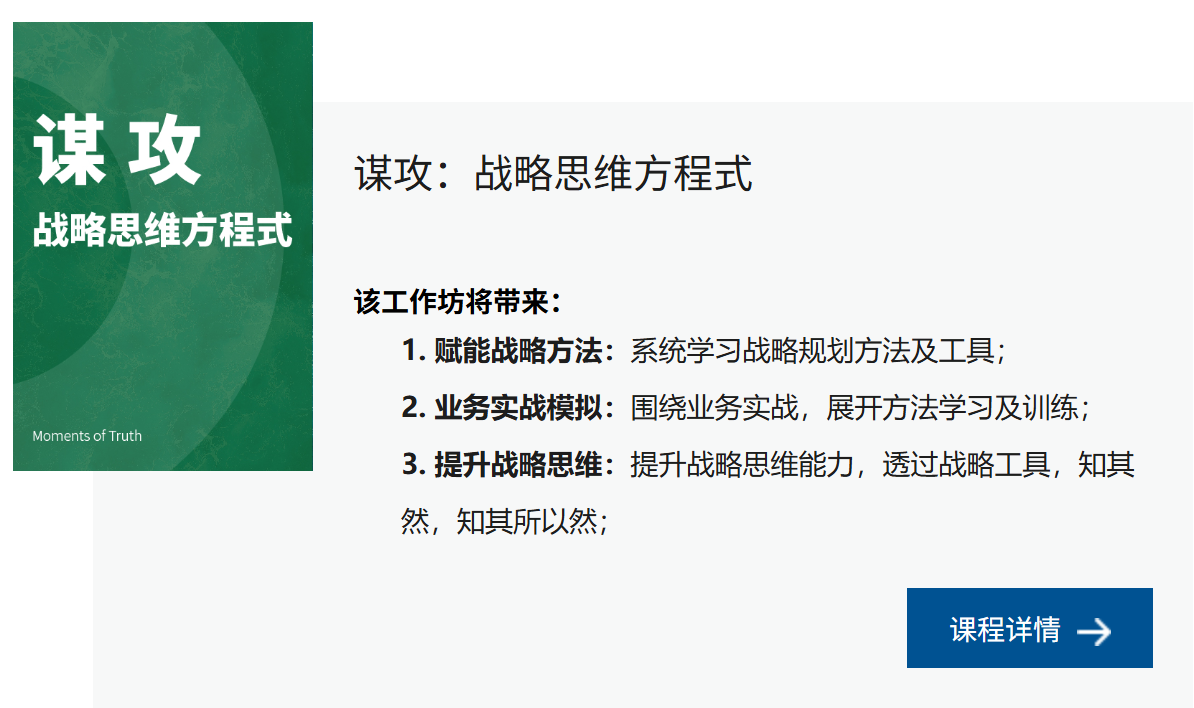 在我们的“商业领导力”模块中,诸如《伐谋®:培养商业领导力:定战略、抓落实》等课程,旨在帮助管理者建立从宏观战略到具体执行的完整思维链条。