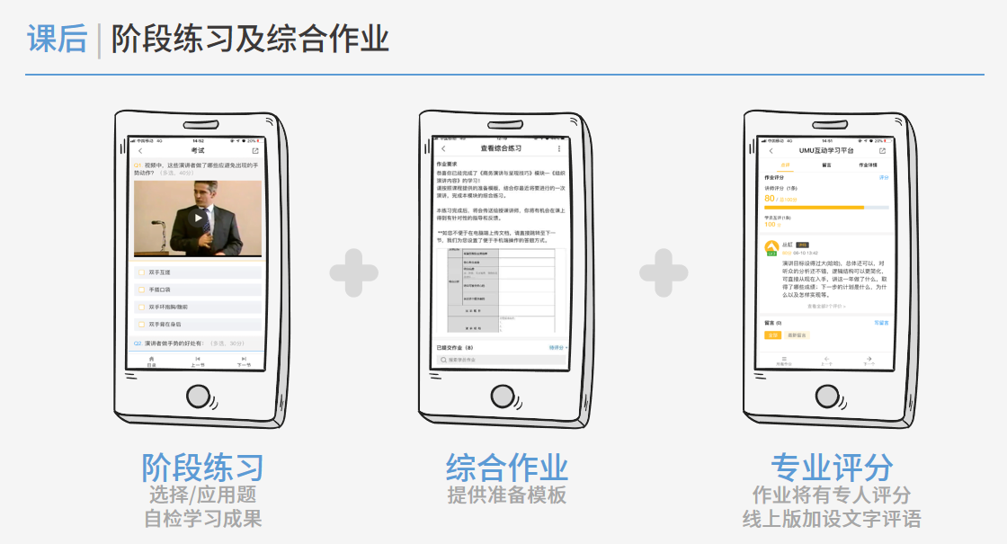 练习作业与模板帮助学员在课前就形成知识点的应用,并针对性改进,课堂上带着课前写好的演讲大纲与PPT,有备而来,练习与改进更有针对性
